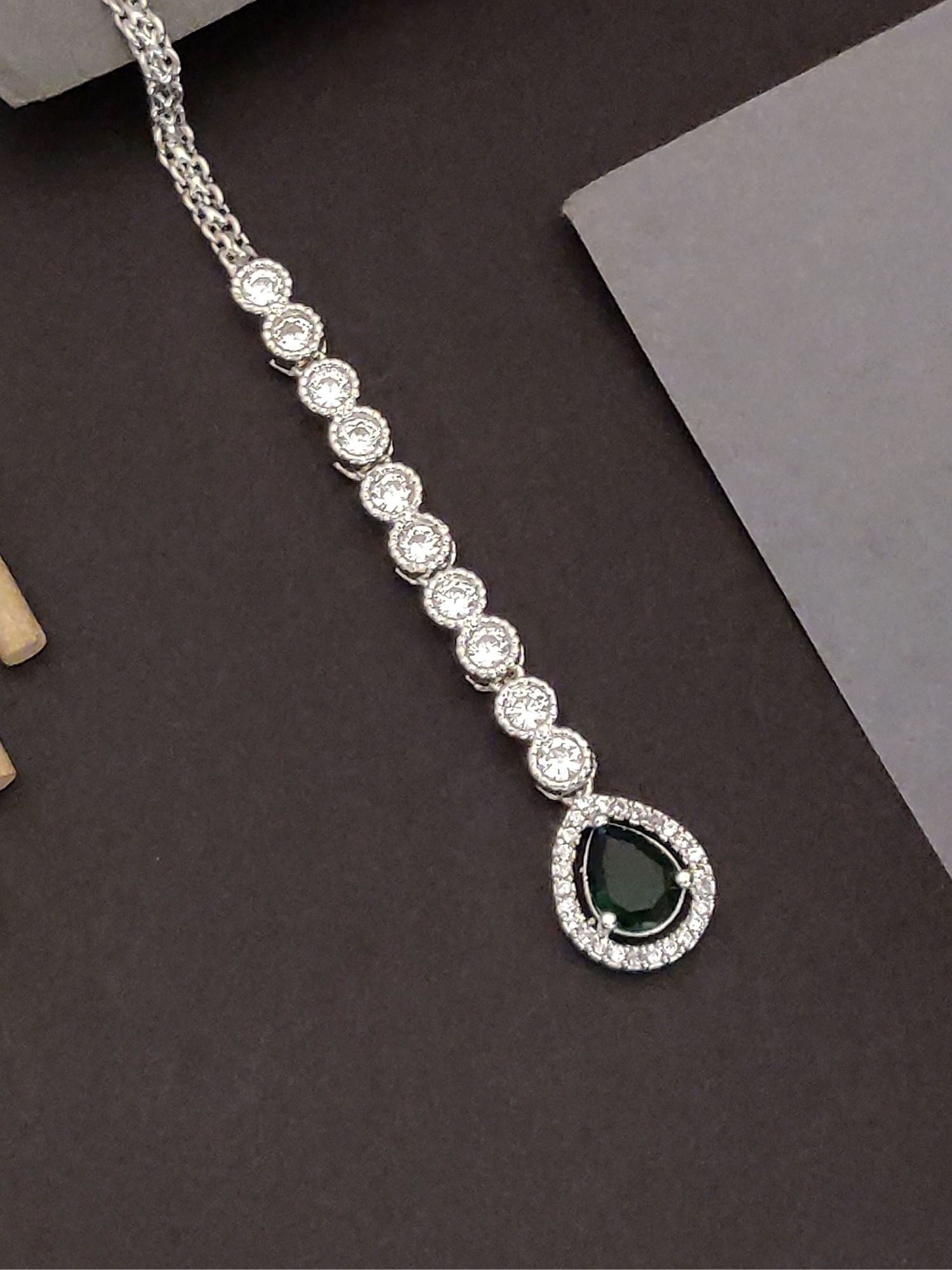 The Abdesigns Silver Teardrop Maangtikka gives a touch of elegance to every special occasion. This piece features sparkling American diamonds set in a bright silver-plated finish. The teardrop shape creates a classic, timeless look. Each curve of the maangtikka catches the light and enhances your style easily.