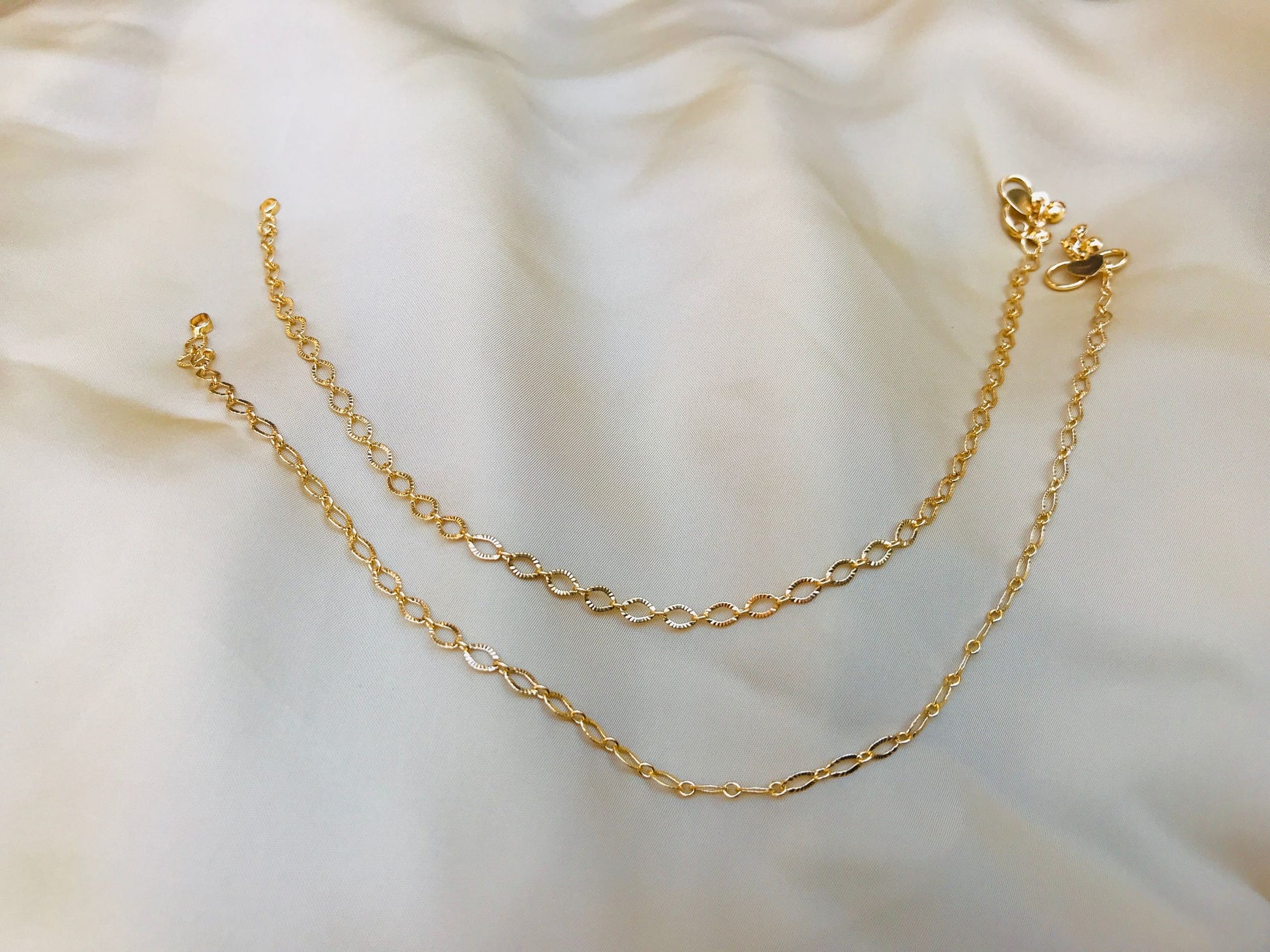Anklets are a type of jewelry worn around the ankle. They can be made of a variety of materials including non precious metal brass, copper, beads, or chains. Some anklets are simple and minimalist, while others are elaborate and decorative, featuring intricate designs and embellishments such as charms, beads, or pendants.